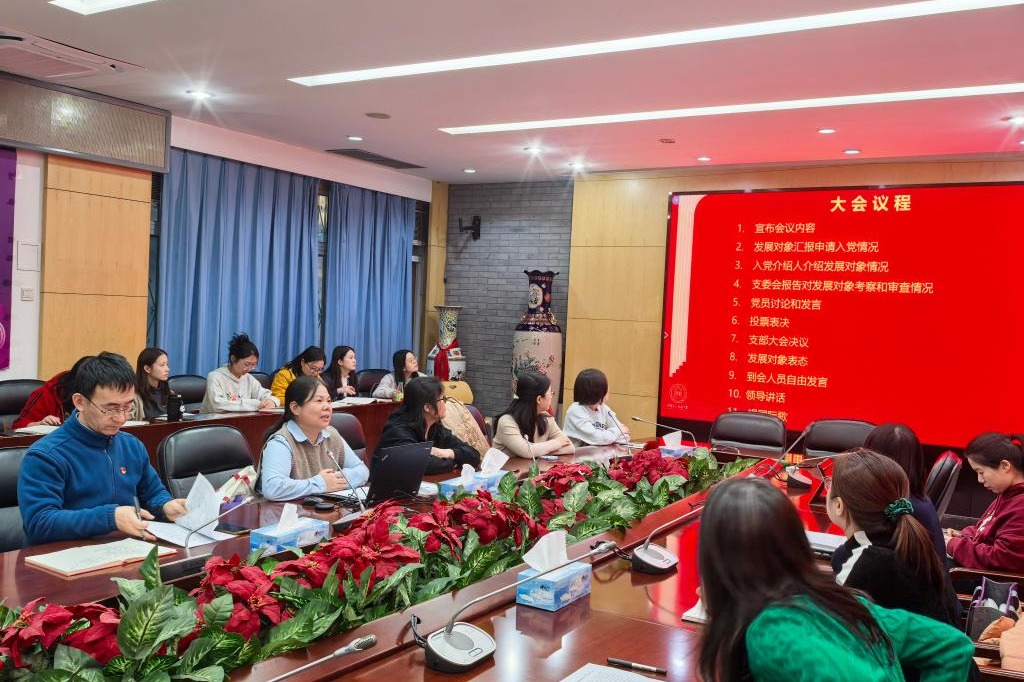 在齐声合唱国际歌的歌声中,支部书记黄丽梅宣布本次预备党员发展大会顺利结束。