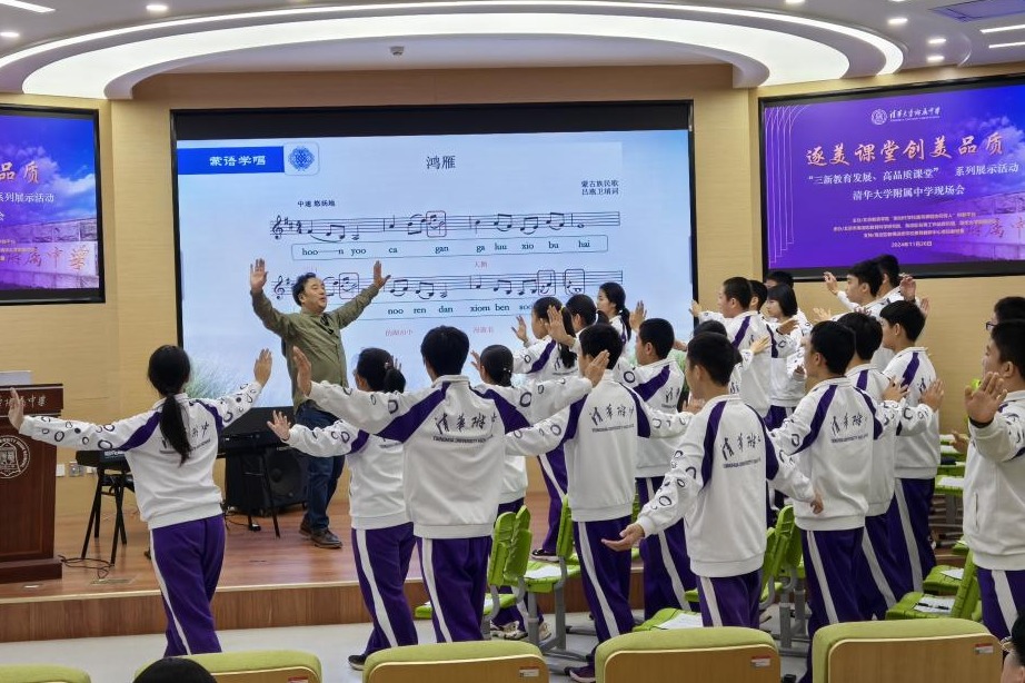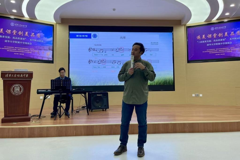 高山老师的授课内容为七年级上册第五单元《草原牧歌》中的蒙古族民歌《鸿雁》。他以传统的口传心授法,汉蒙双语教授,融合蒙古族舞蹈,引领学生步入音乐之旅。课程设计紧贴初一学生认知特点,从发声练习至完整表演,循序渐进。教学注重多维度能力培养,激发学生在欣赏、感知、思考、探究、模仿等实践活动中,积极参与,勇于想象、表达与创新。在教学节奏的安排上,重点关注学生的审美感知能力和艺术表现能力,深化对民歌传承价值的认识,促进对音乐文化多样性的尊重,拓宽文化视野。