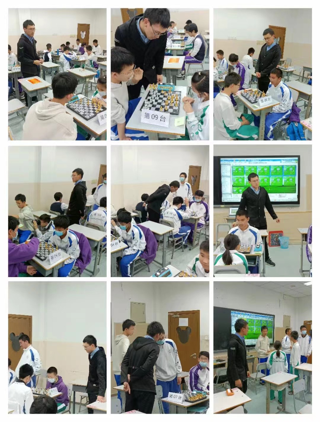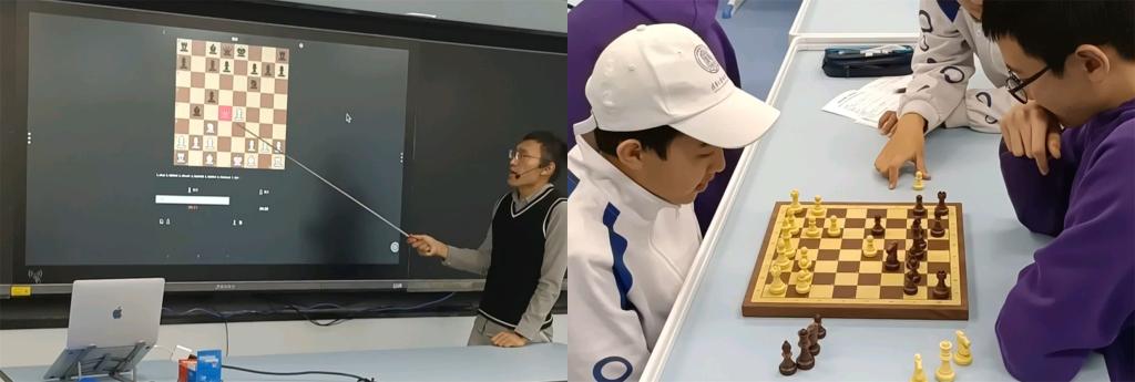 左起:社团活动期间,学生使用电子棋盘chessnut对弈,赵晨光老师正在同步讲解;初2406班缪博约(执白)对弈初2314班宗睿言(执黑)