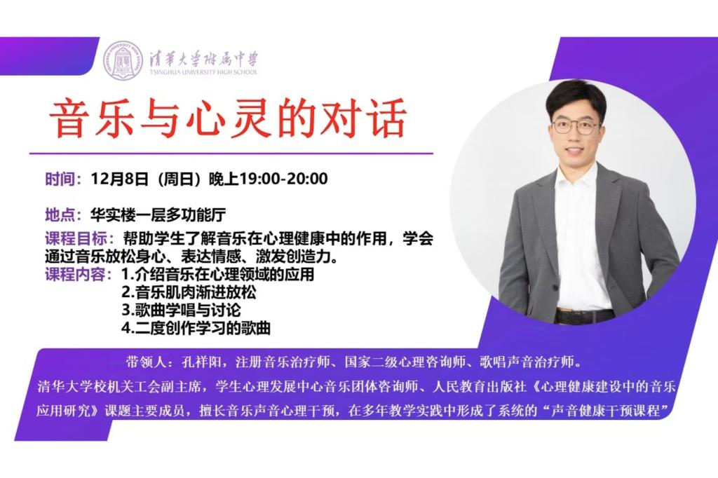 12月8日晚,澳门网上博彩住宿部邀请到清华大学校机关工会副主席、学生心理发展中心音乐团体咨询师、国家二级心理咨询师、注册音乐治疗师孔祥阳老师来进行音乐与心灵的对话辅导活动,来自初高中共15位学生在华实楼多功能厅参与本次活动。