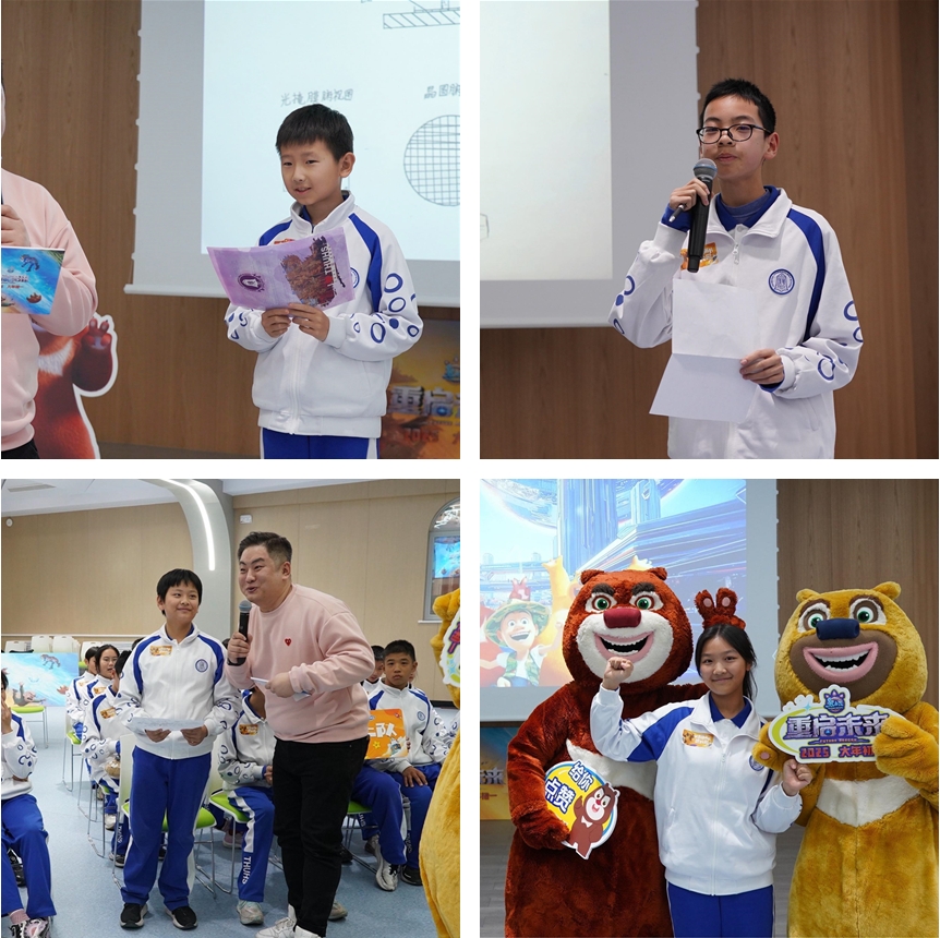 在活动中,熊大、熊二和卡酷主持人不仅与同学们进行了亲密互动,还带来了《熊出没》科幻系列动画的精彩片段,让同学们提前感受“熊强组合”在未来世界的冒险历程。其中的科幻元素也激发了同学们的无限想象力。同学们踊跃发言,分享自己的奇思妙想和创意灵感,赢得了现场师生的阵阵掌声。这些作品不仅展现了同学们的创造力和想象力,也体现了他们对科幻世界的浓厚兴趣和热爱。