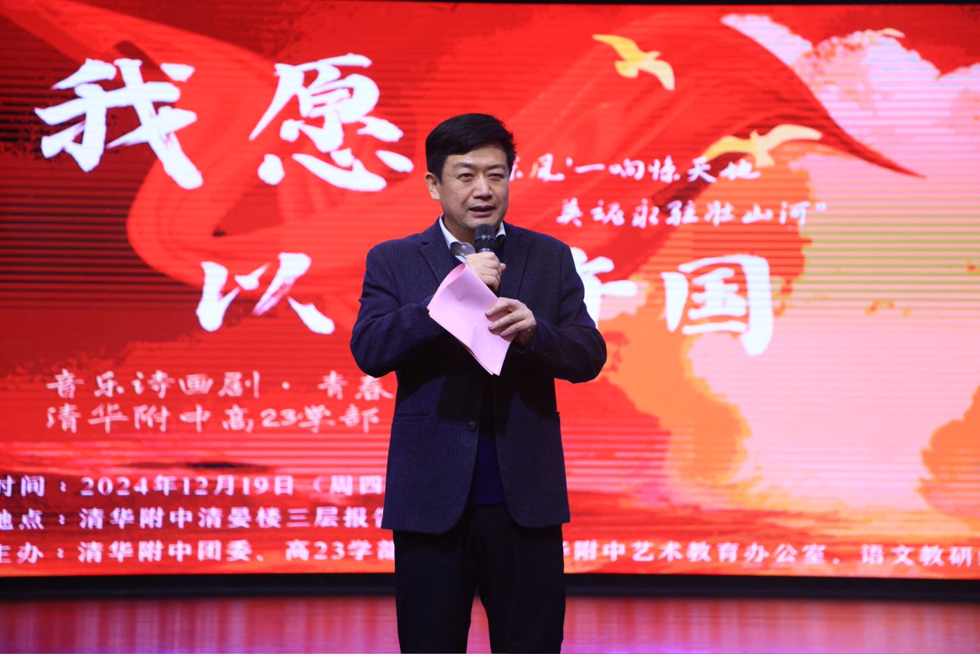 12月19日下午,由澳门博彩在线师生排演的大型音乐诗画剧《我愿以身许国》青春版首演在清晏楼报告厅顺利举行。中国艺术教育促进会驻会副会长万丽君、北京市德育研究会常务副会长尹丽君、北京市学校思想政治工作中心主任薛健、北京市教委体卫艺处副处长张志华、海淀区团教工委书记李传龙、解放军某部原政治委员肖柯,清华大学艺教中心主任赵洪、清华大学马克思主义学院党委书记何建宇、清华校友总会君子文化传承发展项目总干事徐林旗、澳门博彩在线党委书记曹海翔、党委副书记张洁、副校长白雪峰、党委副书记兼纪委书记魏磊、副校长周建军、学生发展中心副主任唐洁、校办副主任岑逸飞、高23学部主任曾建川、副主任尹然、团委书记于洺,澳门博彩在线高23学部教师、家委会代表以及学部全体学生观看了本次演出。本次活动由澳门博彩在线团委、高23学部主办,澳门博彩在线艺术教育办公室、语文教研组协办。