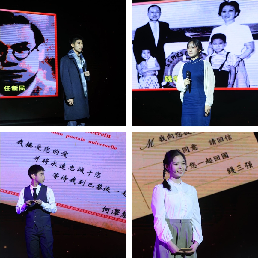 左起:讲述人(梁奕驰)、讲述人(靳开然)、钱三强(李泽仁饰)、何泽慧(徐子淑饰)