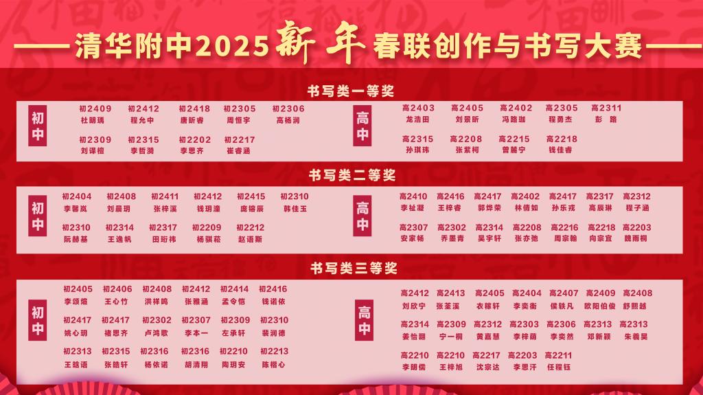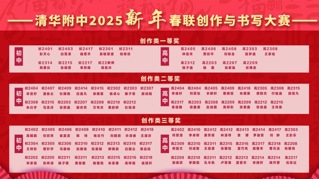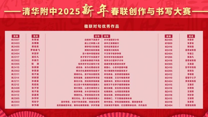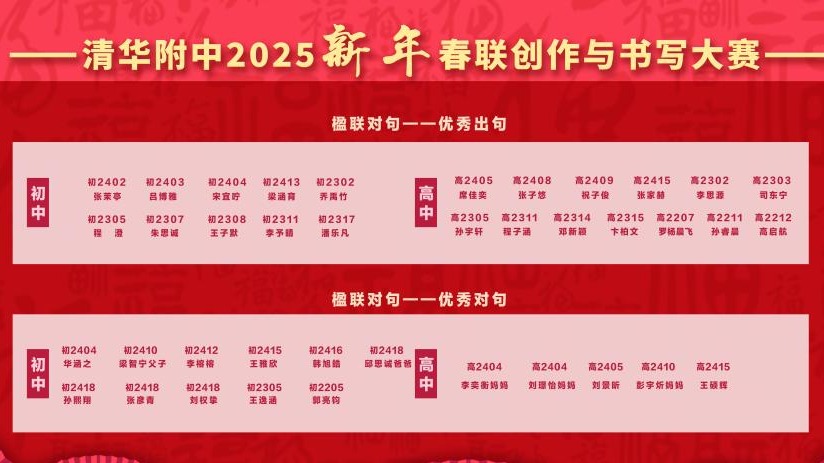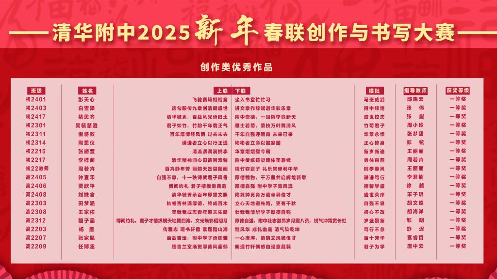 本次春联大赛的创作阶段,每班选送两幅春联参加评选,经语文教研组研讨后,评审出创作类一等奖18位,二等奖30位,三等奖48位。诗以言志,“清华毓秀,百载风光承旧土,附中崇德,一园桃李竞新天”、“百年厚博经风雨过去未去,千年自强迎朝霞未来已来”,一幅幅包含深情的创作承载着附中学子对母校110周年校庆的祝福之情。
