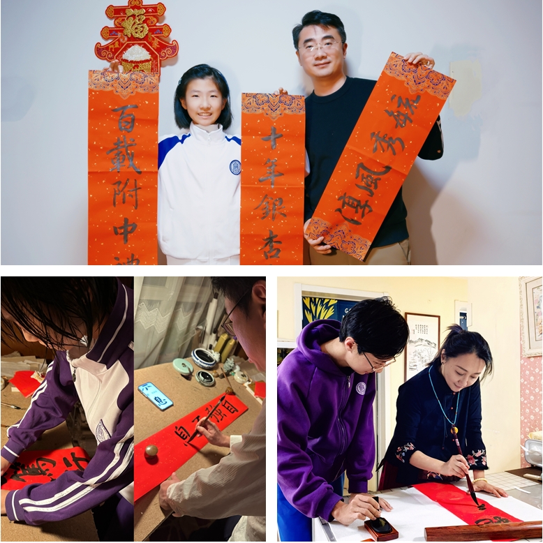 初2407班徐艺嘉一家、高2405班刘景昕一家、高2314班吴宇轩一家共写春联