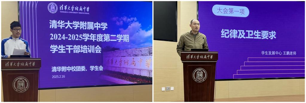 会场由学生会副主席高2316班简耀远主持。首先,学生发展中心王鹏老师从纪律卫生方面对同学们作出重点提醒,他提出上一学期同学们在球类进班、电子黑板使用、重大活动班级卫生、外墙装饰等方面的不足,并呼吁大家在新的学期予以改进,同时再次明确了奖惩机制,号召全体同学以主人翁意识共同参与校园建设,另外,王鹏老师还提醒同学们保存好志愿学时证明、继续推进水木行动。