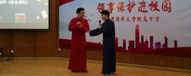 外交部领事保护中心邀请到童若愚和马远清为大家表演了相声《安全须知》,在轻松的气氛中传授了安全知识。精彩的相声表演赢得了台下师生家长们的阵阵掌声,同时也让观众们意识到在国外应时刻树立安全意识。