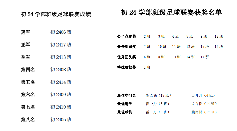 3月24日下午,足球联赛闭幕式在操场举行。学生发展中心副主任李冰清、校少先大队辅导员付帅、初24学部主任向东佳、副主任曹佩、体育老师及各班班主任,为获奖班级和个人颁奖。奖项包括团体1-8名、公平竞赛奖、最佳组织奖、优秀团队奖、突出贡献奖等团体奖项,以及最佳守门员、最佳射手、最佳球员等个人奖项。