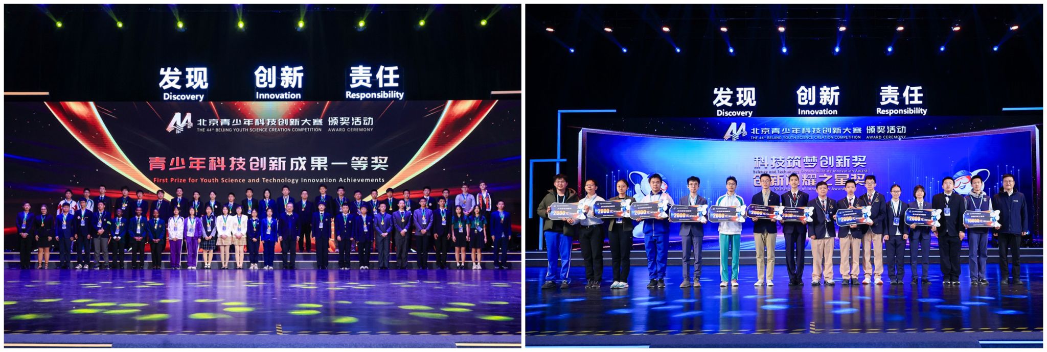 北京市青少年创新成果一等奖(前排左九:徐冰瑶;左十:杨雅涵;后排左二:国家恺)、北京市科技筑梦创新奖(左六:国家恺)