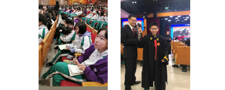 惊堂木、法槌、法袍……王志勇法官用亲切而幽默的口吻一一介绍,仿佛在介绍他的好朋友一般,让大家对“法官”这个似乎不苟言笑的职业多了几分活泼的印象。一个个触目惊心的案件,一则则庄严肃穆的法律条文,让大家意识到“法”的威严,意识到和“法”就在我们身边。