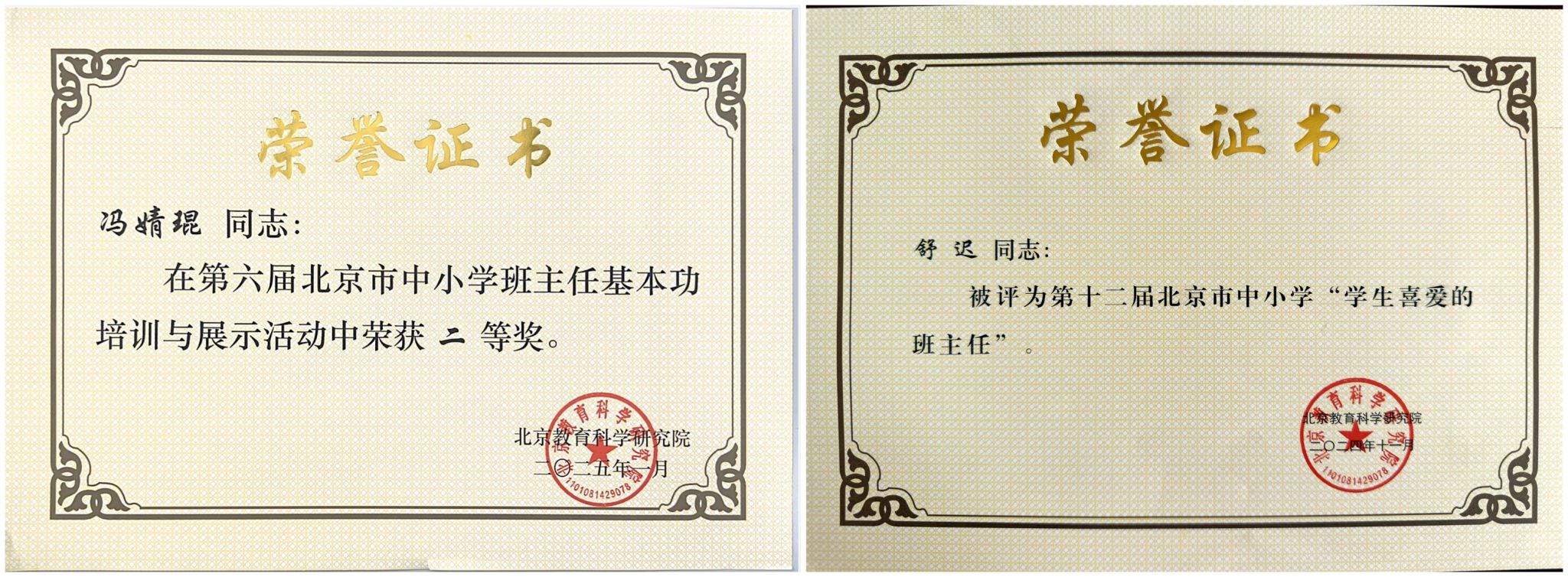 冯婧琨老师荣获北京市中小学班主任基本功培训与展示活动二等奖、舒迟老师获评北京市中小学“学生喜爱的班主任”