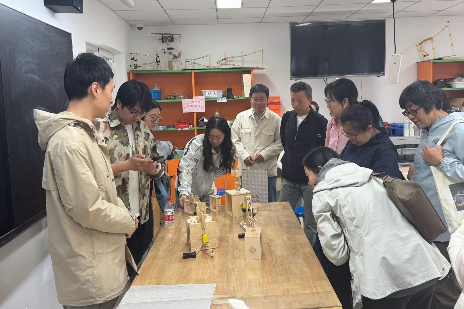 座谈交流后,老师们参观了澳门网上博彩通用技术实验室。申大山老师结合学生作品,介绍了木偶机(传动玩具)项目的开设与实施情况,展示了如何将艺术与技术相结合,激发学生学习兴趣与创造力。孙振杰老师结合学生建筑模型作品,介绍了建筑模型课程的开设情况,展示如何培养学生的空间思维能力、工程实践能力与团队协作精神。李晟宇老师介绍了3D打印机、激光打标机等高性能设备的功能与应用,并展示了这些设备在学生项目式学习中的重要作用。
