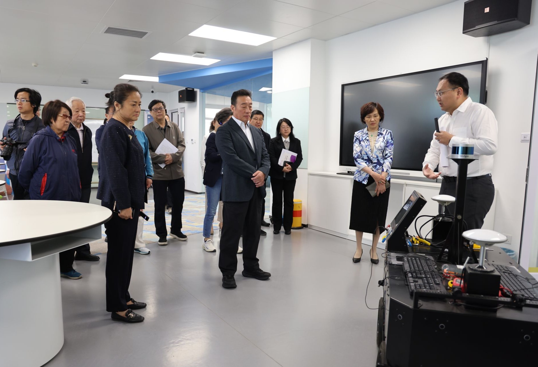 考察团实地参观了学校科技教育设施,重点走访了创客空间、高研实验室等特色教学场所。参观路线涵盖能源系统、机器人、地理信息等六个高研实验室,以及学生科创作品展示区、自主搭建平台等实践教学成果。