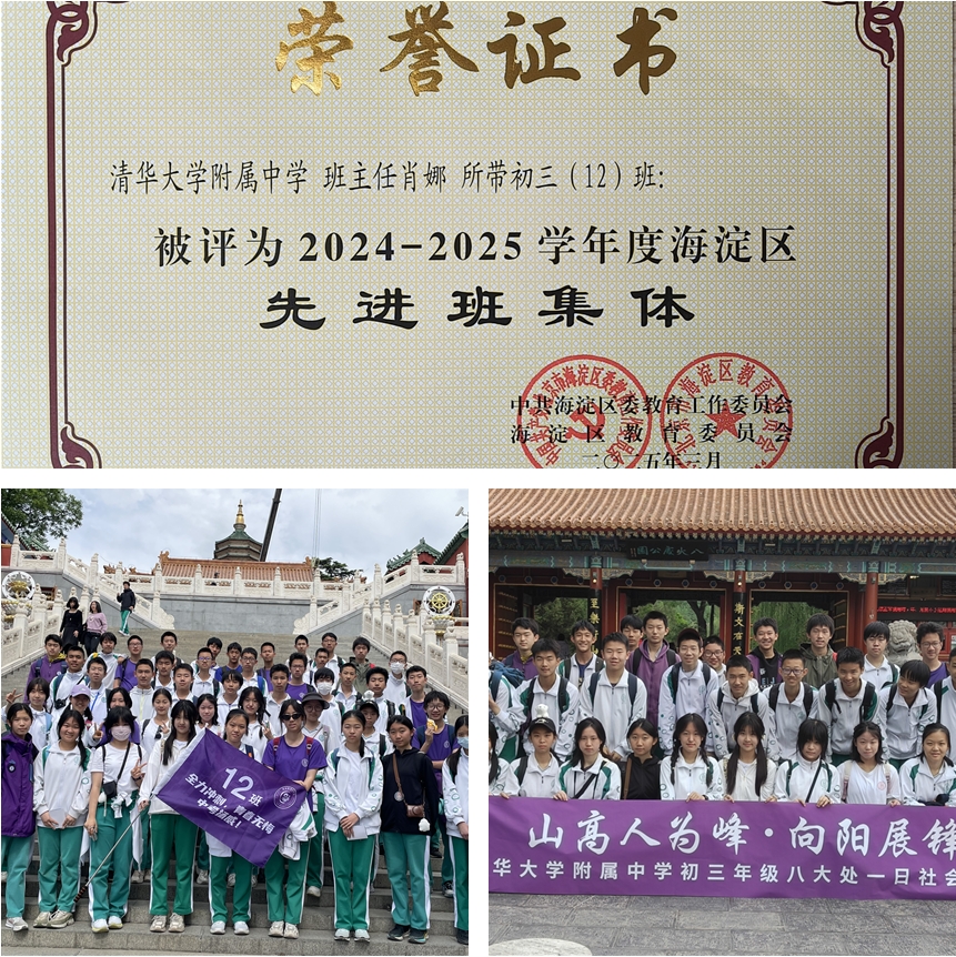 初三12班荣获海淀区先进班集体荣誉证书、班级活动合影