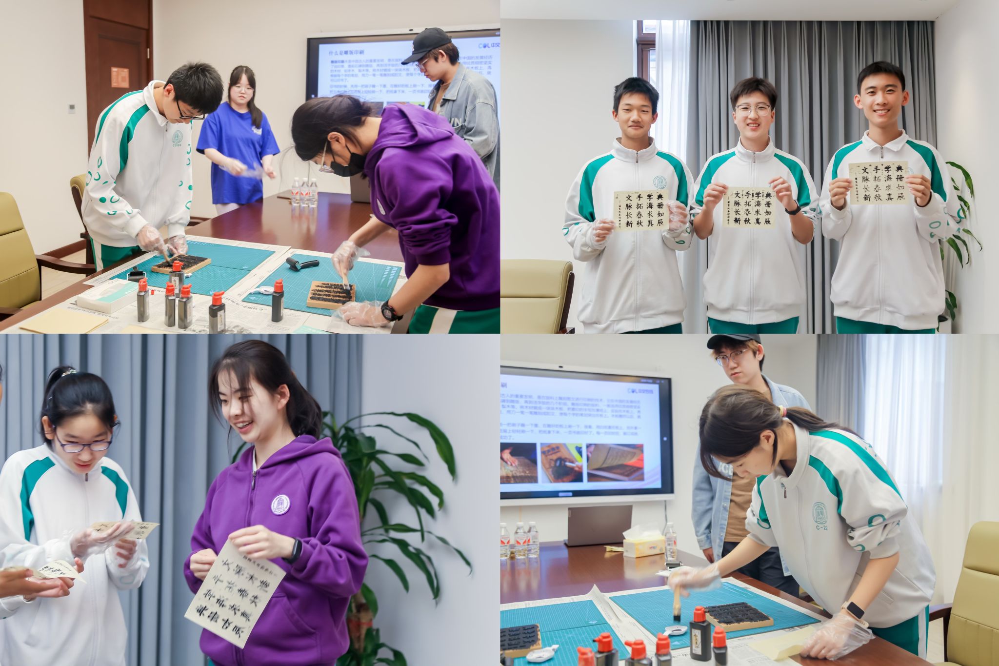 除了参观展览之外,本次活动还深度融合“观展-研学-实践”三维教育体系。同学们在探访版本典藏区、数字资源库与文明互鉴展厅后,可亲手执握明代雕版套印模具,在松烟墨香中实践雕版印刷术体验,感受古代匠人风骨;还学习了“穿针引线定经纬”的线装书装帧课程,运用宣纸、针、线等传统材料,将单页纸张通过线装书转变为书册,实现从“文化旁观者”到“技艺传承人”的角色转化。学生们不仅在雕版印刷、线装书等非遗技艺实操中深化对中华典籍版本体系的理解,更在穿针、拓印的指尖律动中,让中华文脉传承具象为可触摸、可带走、可延续的文化记忆。