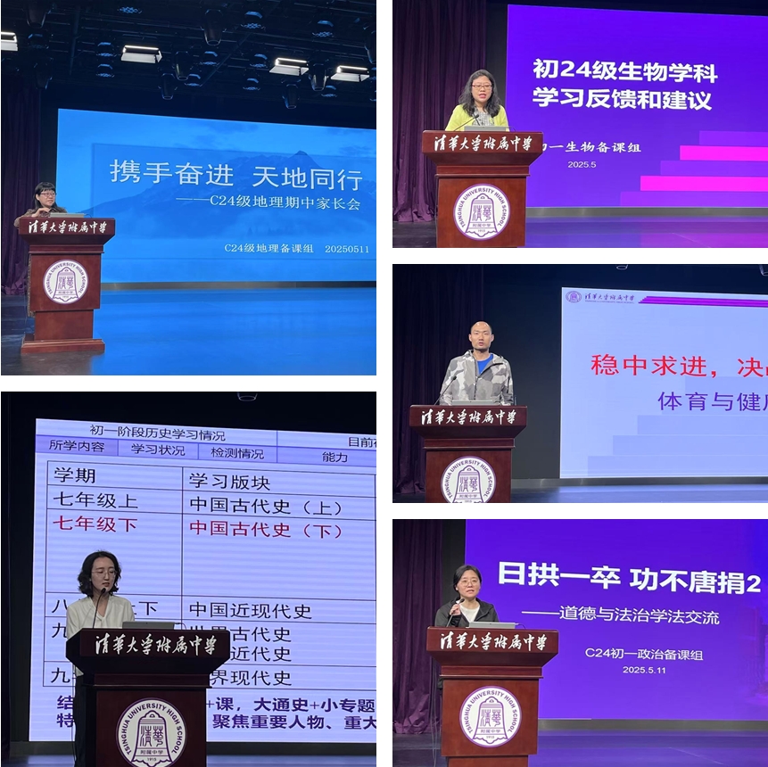 首先,由历史、道德与法治、生物、地理、体育备课组长代表本学科老师进行期中学习反馈和学科指导。历史备课组长张月瑶老师介绍了初一阶段历史学习的重点与难点,分析了学生当前存在的问题,并给出了针对性的学习建议;道德与法治备课组长谭晨老师结合具体案例,解析了本学科的试题特点与考查维度,肯定了学生取得的学习进步,同时指明了后续的努力方向;地理备课组长唐秀梅老师总结了上半学期的学习内容,强调了知识梳理及实题演练的重要性,并提出了本学科日常学习的具体要求;生物备课组梁姝颋老师从课堂听讲、课后复习、作业要求等方面提出了具体的学习建议;体育备课组长王鹏老师强调了体育对锻炼意志品质的重要性,并针对体育学考,分层给出了科学的练习建议。
