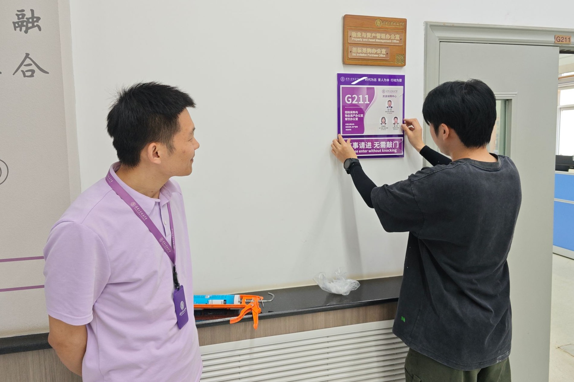 安装师傅粘贴办公室门贴