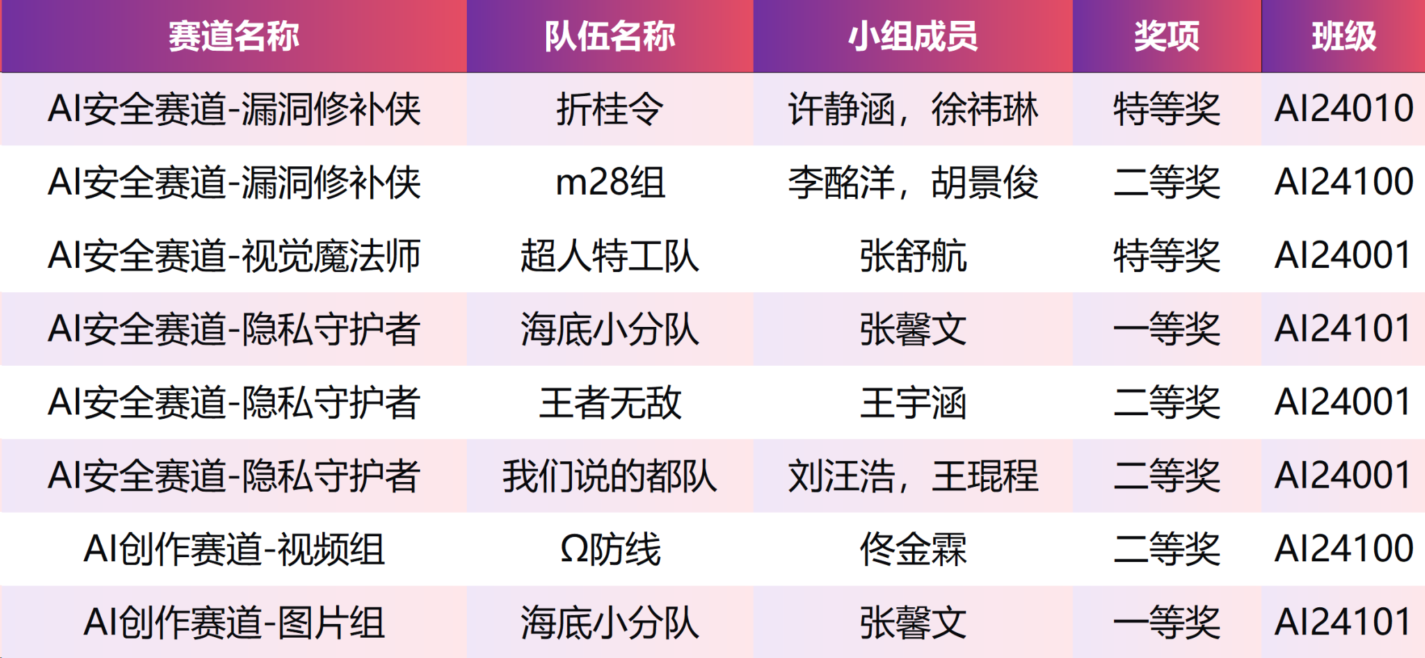 “AI安全赛道”考验青少年的技术能力与安全思维,包含“AI泄密防范大挑战”、“AI图像识别误导大挑战”、“安全科普网站漏洞修补大挑战”三组赛题。其中,张舒航在“AI泄密防范大挑战”赛组获特等奖;许静涵和徐祎琳在“安全科普网站漏洞修补大挑战”赛组获特等奖,李酩洋和胡景俊获二等奖;张馨文在“AI泄密防范大挑战”赛组获一等奖,王宇涵、刘汪浩和王琨程在该赛组获二等奖。
