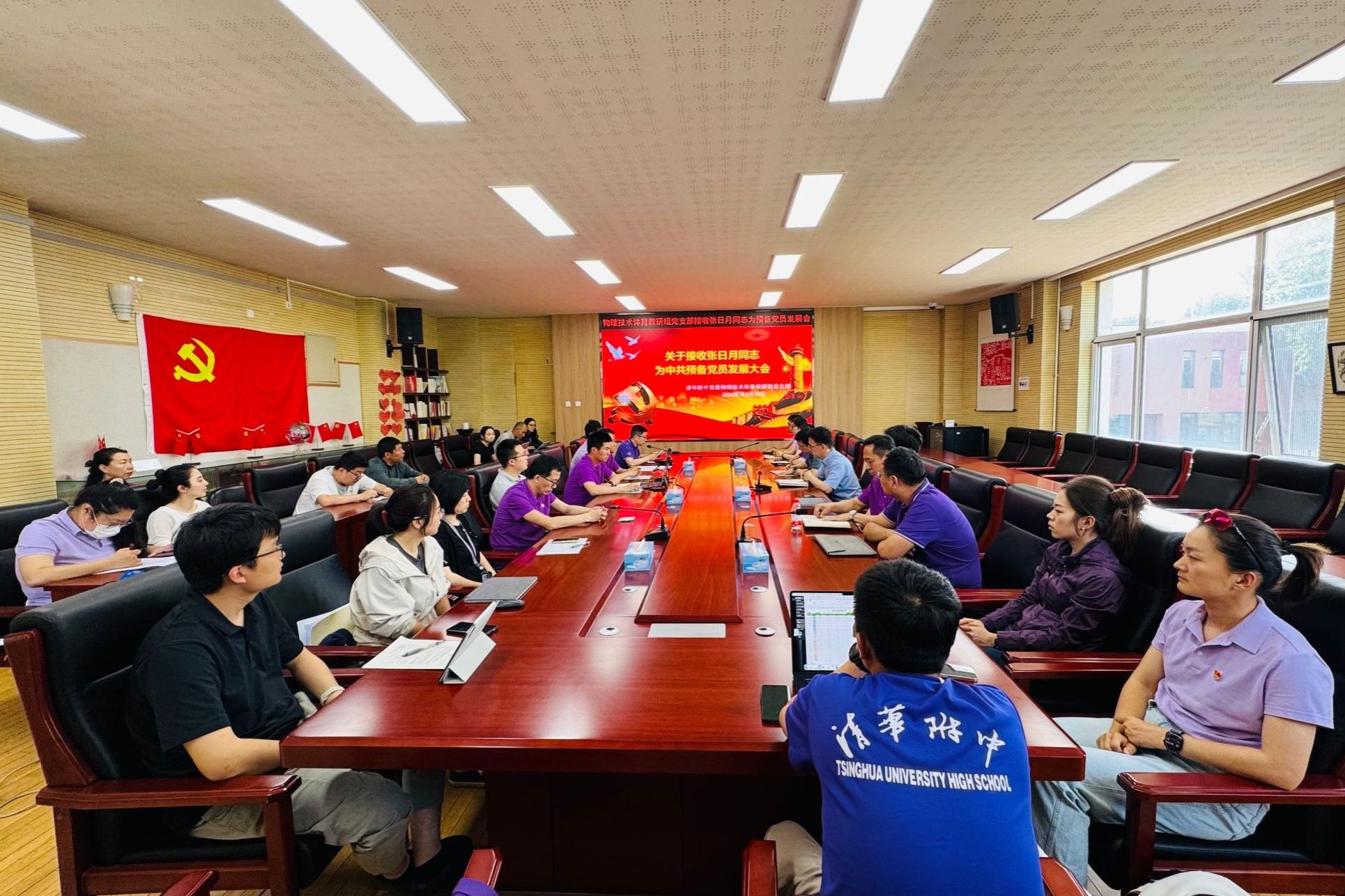 本次发展大会严格按照党组织接收预备党员的程序进行。首先,张日月同志汇报了入党的有关情况,表明了自己入党的态度和决心。申大山、付帅老师作为入党介绍人发言,两位老师认为张日月同志在思想上追求进步,入党动机端正,入校十一年来工作兢兢业业认真负责,专业能力强,同意张日月同志加入中国共产党。同时希望张日月同志继续加强政治理论学习,不管是在体育课的日常教学还是安全保障工作中能够再接再厉,为附中的稳定发展保驾护航。