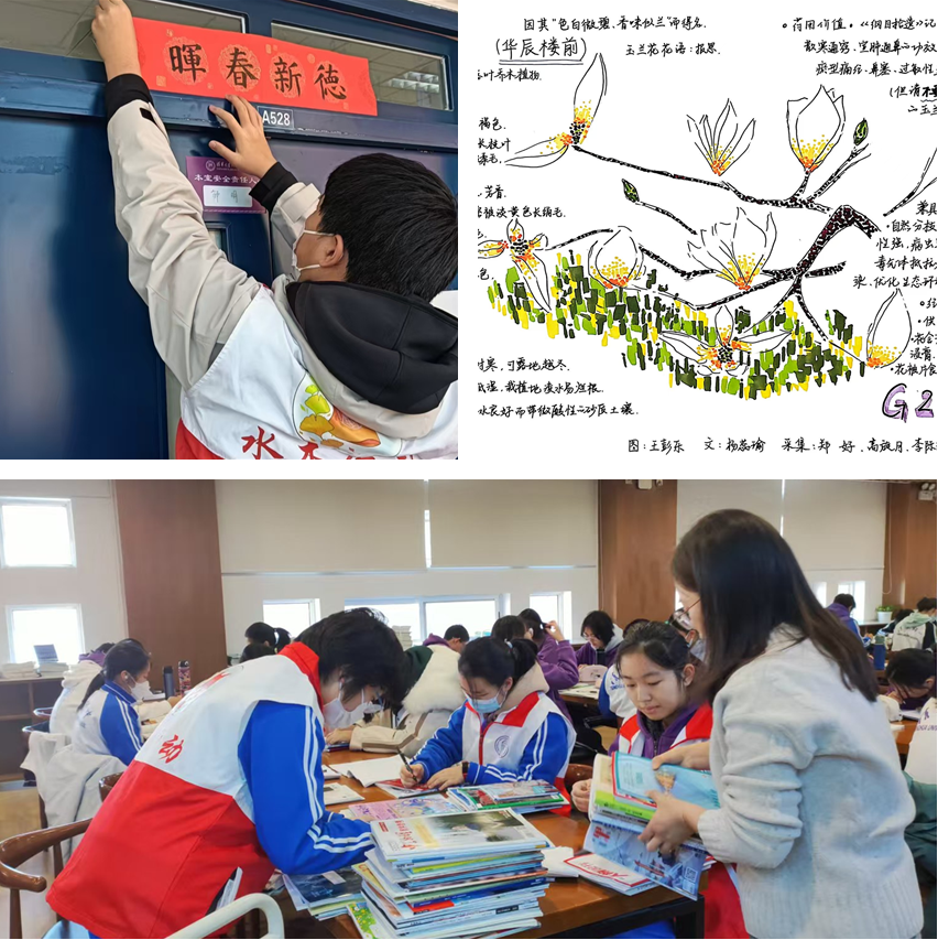 水木行动揭旧春联、制作校内赏花图,星级班级整理图书馆书籍