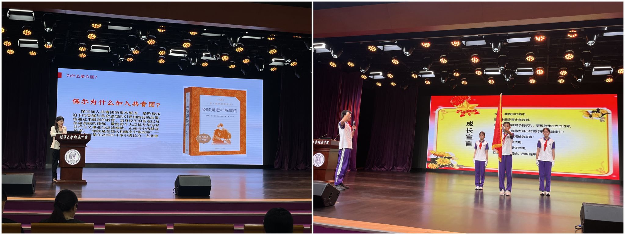 初23学部李雨宸妈妈为同学上团校第二课、少先队员代表张轩睿代表同学们进行成长宣言