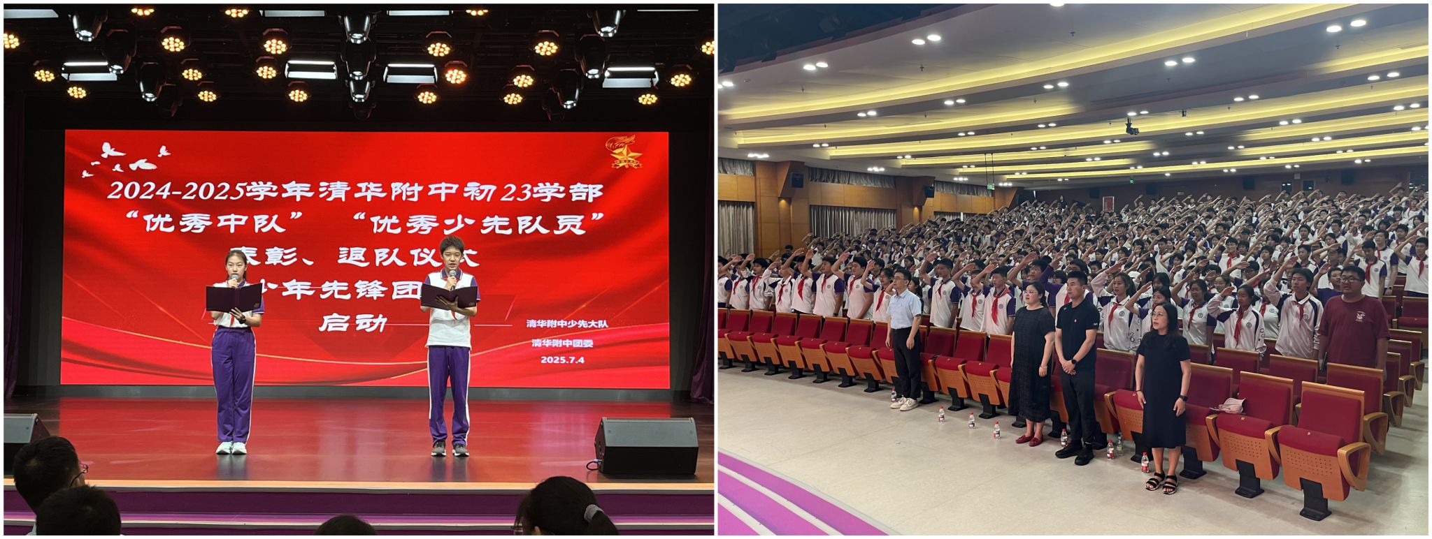 靳沐霏同学、林九牧同学主持本场离队建团仪式,全体师生奏唱中华人民共和国国歌