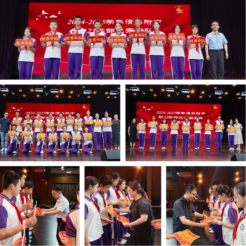 学生发展中心副主任李冰清老师宣读优秀少先队员、优秀中队、优秀班集体表彰决定。首先,优秀中队代表9名(3班白雨阳、10班张雨佳、11班马蔚容、12班张昊辕、13班姜歆岳、14班孙势为、15班唐易江、16班王启越、17班李明阳)登台,党委书记曹海翔为中队授牌。接着,17名优秀少先队员(1班吴毓慧澄、2班綦芳菲、3班路雨茗、4班梁语初、5班程澄、6班靳沐霏、7班顾鎏淳、8班路畅、9班黎凝然、10班何晨蕊、11班马蔚容、12班侯雨晨、13班夏若茗、14班周楷轩、15班黄宇晴、16班蒙卓然、17班李梓珺)登台,副主任李冰清与团委书记于洺共同颁奖。最后,优秀班集体班长代表(4班林雨晨、7班王子轩、11班林九牧、12班陈溪源、13班崔紫萱、14班徐冰瑶、15班邱显雅、16班胡清翔、17班张美贻)登台,学部主任张晓琼、副主任周小玲颁发荣誉。掌声如潮,榜样之光映照会场,诠释着“博学笃行、创新进取”的附中精神。