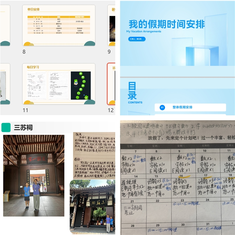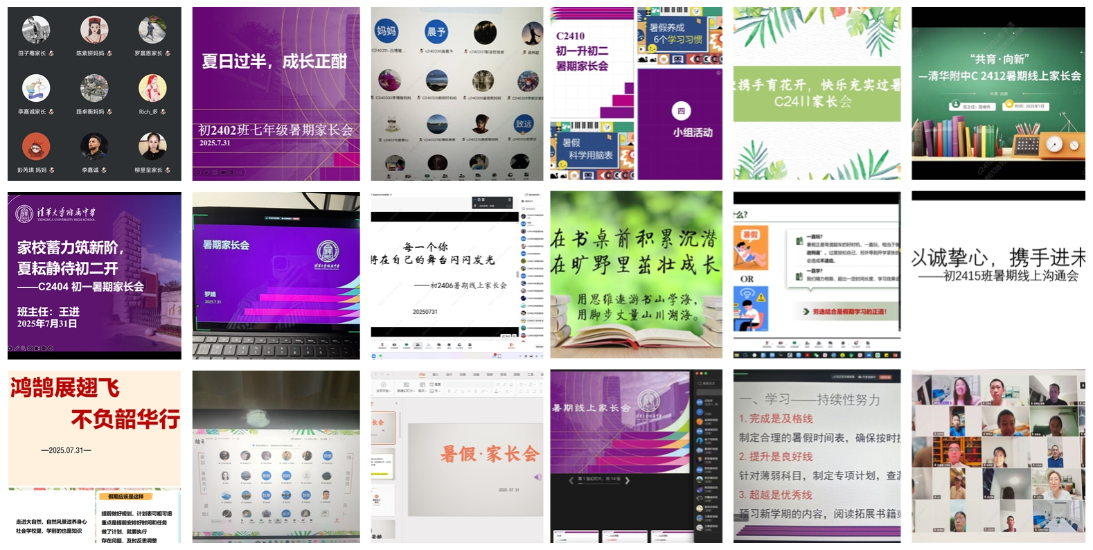 各班总结了暑假前半段学习成长小组的活动,鼓励同学们继续开展线上、线下的学习成长小组活动,与同伴共同进步。部分班级组织优秀同学或学长分享学习建议和假期规划,引导同学们合理安排暑假生活,过充实而有意义的假期。各班也提出了初二阶段的学习愿景,结合新形势和各班学情,提出了具有针对性的学习建议,引导家长共同帮助学生树立清晰的初二学习目标与规划。