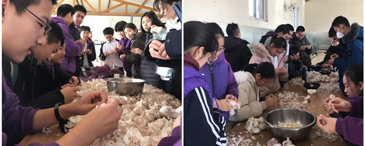第三个环节——做义工。主要工作是打扫餐厅卫生和制作腊八蒜。制作腊八蒜的第一步是剥蒜,一开始每个人都小心翼翼的,既怕刺激眼睛,又不想弄疼指甲。但没过多久,同学们就能熟练地剥蒜了。大家一起唱着歌,不知不觉剥完了100斤蒜头。看着晶莹剔透的蒜头装满一个个大盆子,虽然指甲有些疼,但心里还是被满满的成就感包围。腊八蒜的制作,看似简单,实际易学难精,需要长时间的经验积累,才能做好可口的腊八蒜。时间有限,同学们只能跟太阳村的老师学到基本操作方法。