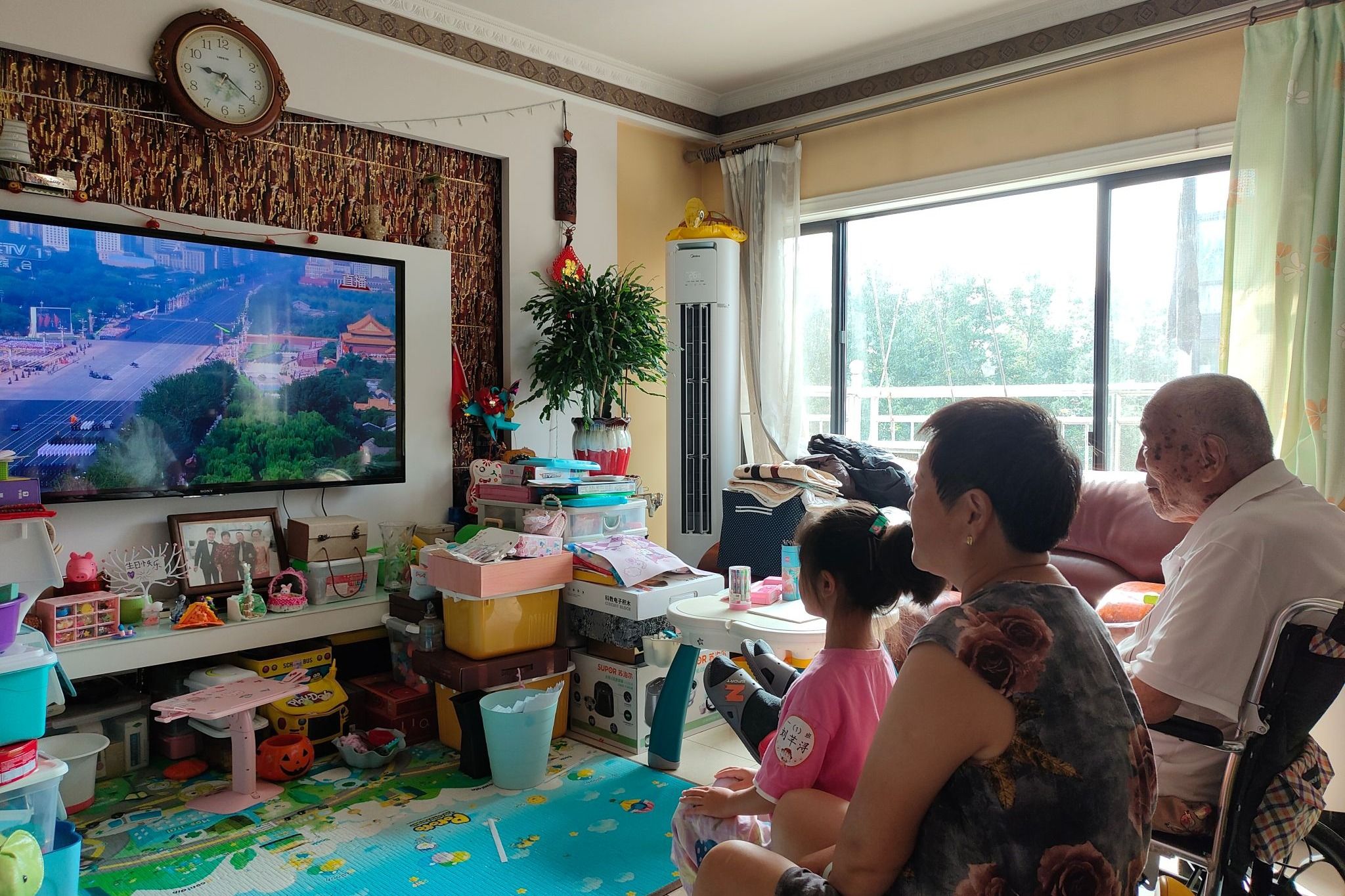 附中离退休教职工党支部党员周燕红与父亲(曾参加解放战争和抗美援朝的97岁退伍老兵)和孙女(一年级新生)共同观看大会直播