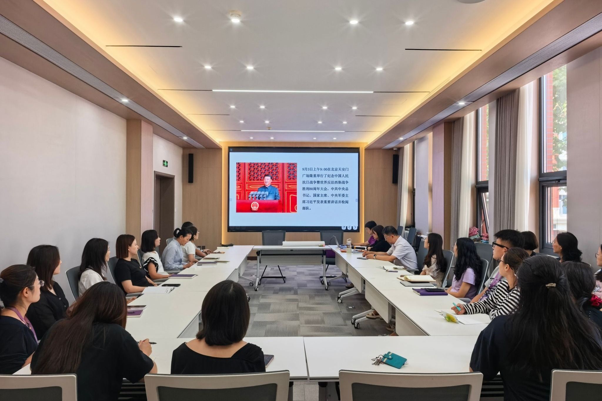 教育职员党支部全体党员回顾九三阅兵盛况