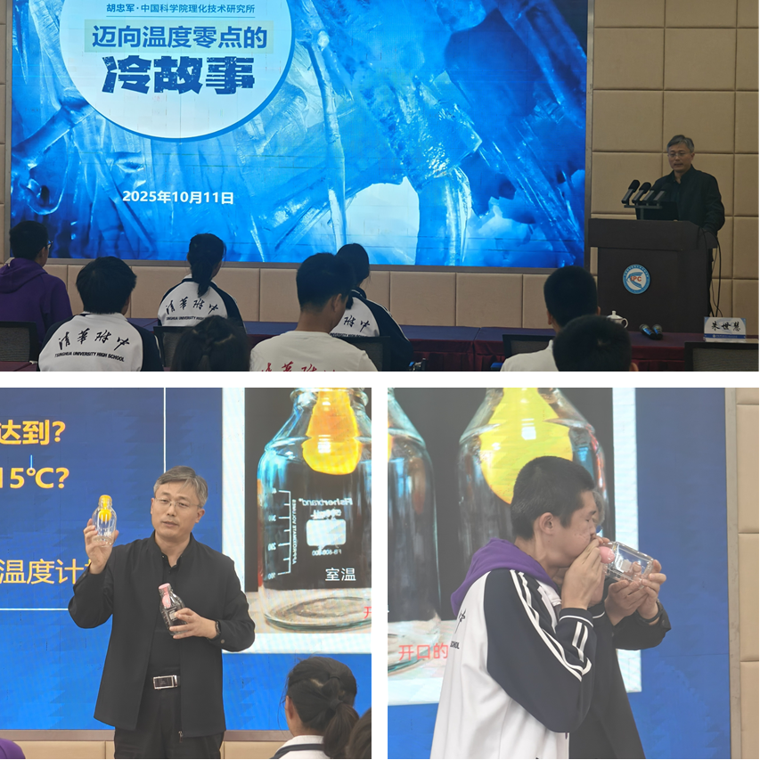 微电影落幕后,中科院理化所胡忠军研究员为同学们做了题为《迈向温度零点的“冷故事”》的讲座。他从古文字中的“冫”“氵”等说起,一步步讲解温度是什么,低温是什么,低温研究有什么应用,以及科学带给我们的精神。为同学们搭建起一个通往并不广为人知的“冷”门学科的桥梁。