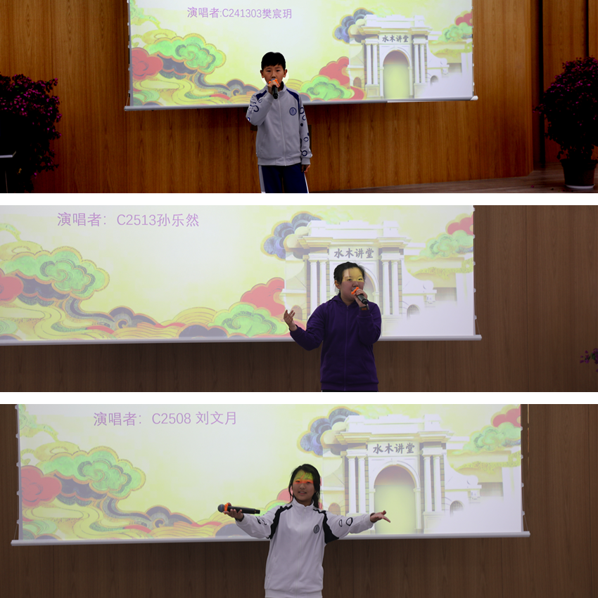 初2413班樊宸玥演唱《灯火里的中国》、初2513班孙乐然演唱土家族民歌《阿惹》、初2508班刘文月演唱彝族民歌《海菜花又开》