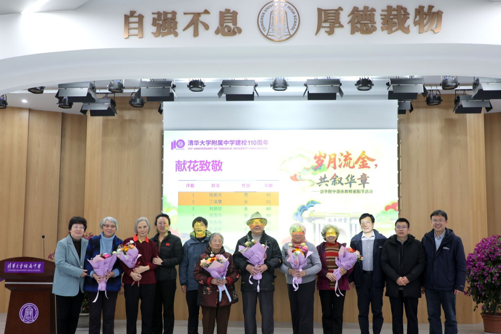 在献花致敬环节,张能光(95岁)、丁淑慧(91岁)、刘荫珍、吴淑华、邢秀珠、陈晶勋(均为80岁)等六位老教师代表接受了校领导献花。当鲜花递到老教师手中时,全场自发响起热烈掌声,场面感人。