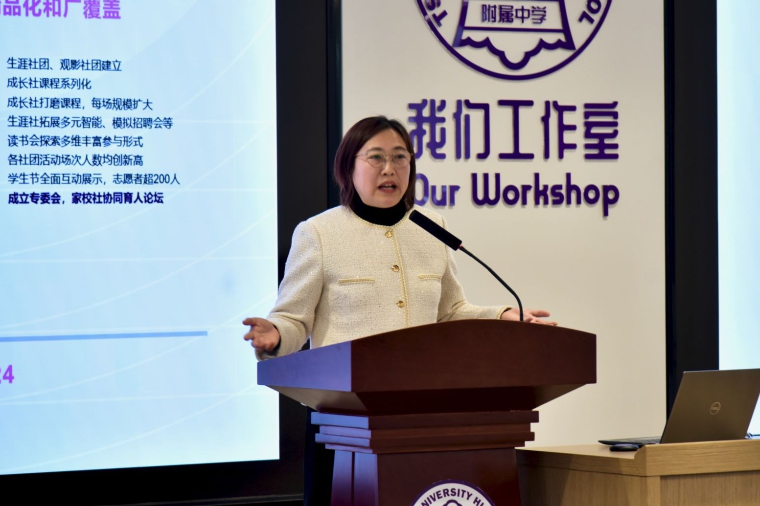 随后,家委会各部门负责人分别汇报了上一年度的重点工作与成果:组织宣传部郭逸飞妈妈分享了在成员流动管理、重大项目SOP制定、核心志愿者招募及家校共育公众号维护等方面的经验;终身学习部李赞妈妈介绍了“三大社团”——水木情芬读书会、家庭成长社与生涯社的系列活动成果,其中包括生涯规划行家开讲、百职讲坛、外出探访与模拟招聘会等特色项目;社团公益部王汩润妈妈提出了“打造有温度、有深度、有广度的社团”理念,介绍了相伴跑团、观影社、书画社和健康社的建设情况;综合保障部王贺章妈妈总结了在校服管理、食堂监督、基金报销、西门执勤及入校报备等方面的创新实践,有效提升了家校协作效率与服务质量;高22学部家委负责人、校家委会顾问李欣垚妈妈结合自身经验,分享了家委工作的精神内涵与时间平衡、意义取舍等心得。