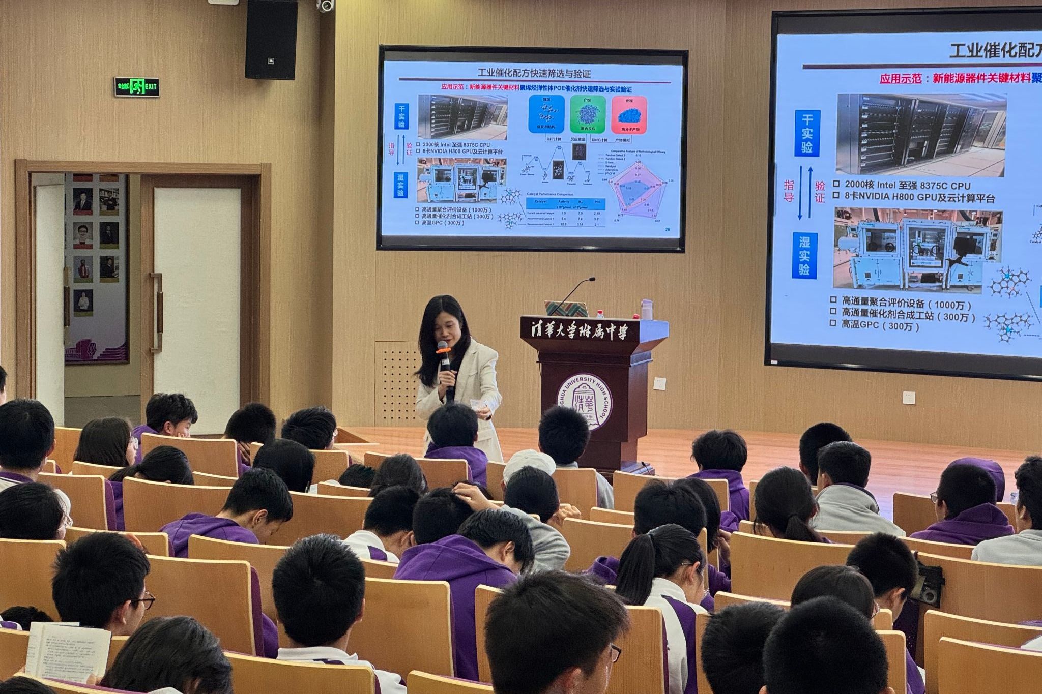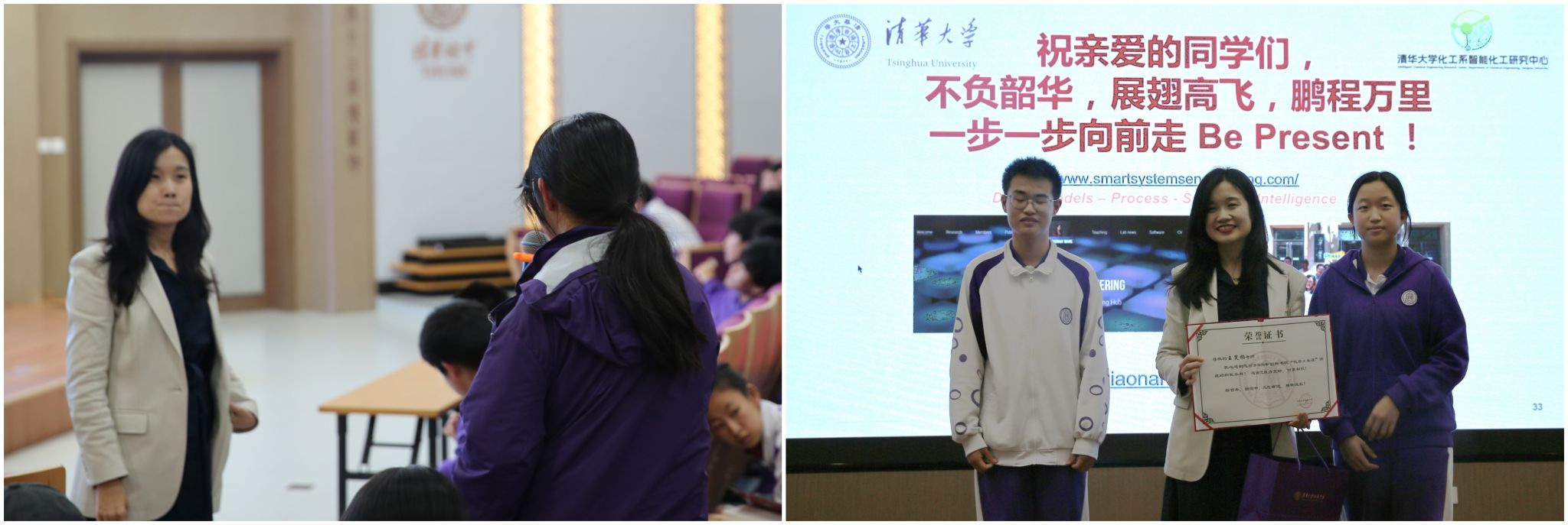 王笑楠老师以自身成长经历开场,从山西临汾一中的学子到清华大学、欧美顶尖学府的科研工作者,再到回归清华投身“人工智能+化工”前沿领域,她用亲身经历告诉同学们:“科学没有边界,成长充满可能。”她鼓励学生从“做题家”转变为“出题家”,勇于提出真问题、探索未知领域。