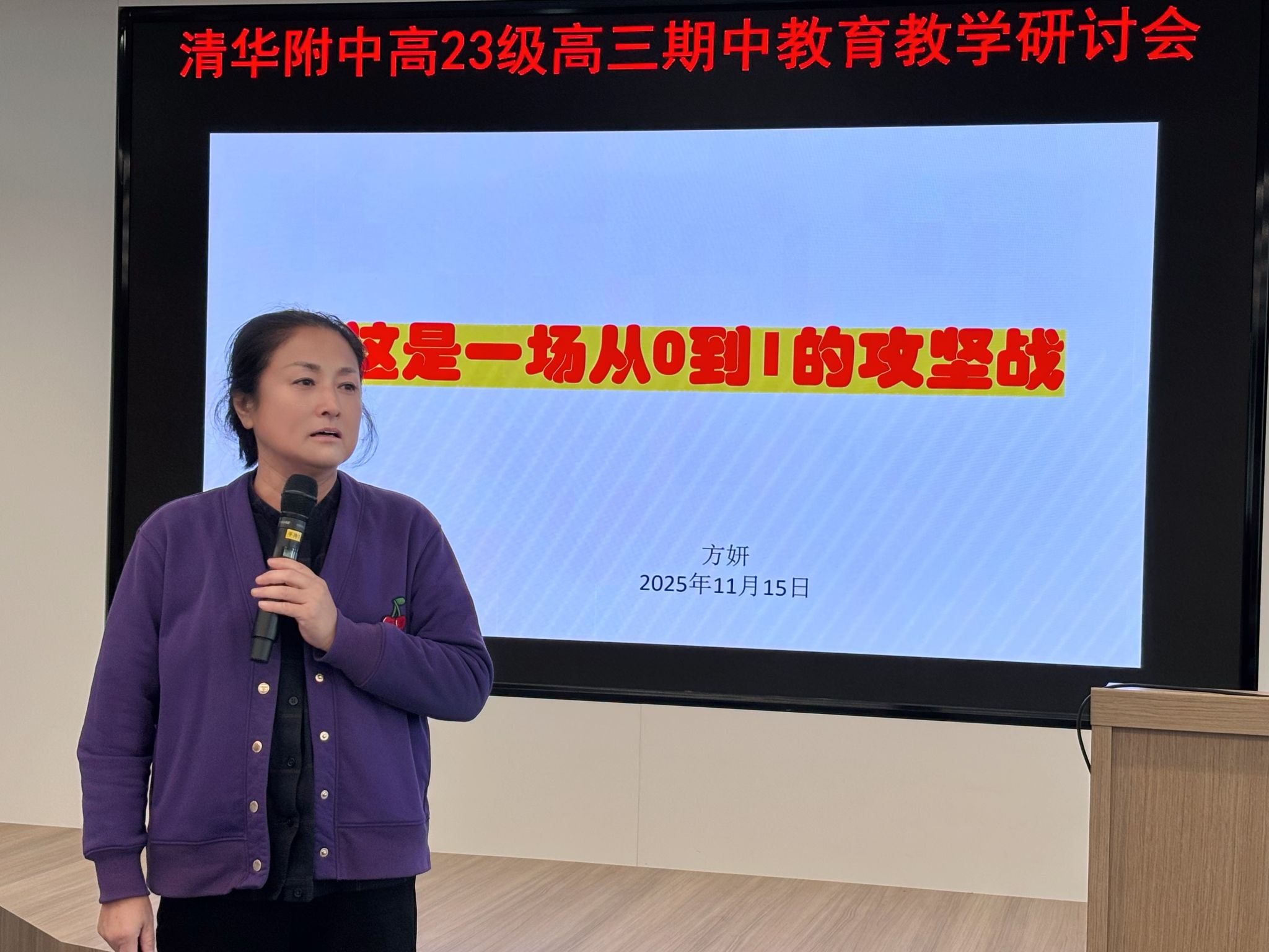 方妍校长以《这是一场从0到1的攻坚战》为题致辞,肯定毕业班前期工作,认为毕业年级是“可以为附中带来历史荣光的队伍”。她围绕学校建校110周年向111周年跨越的新节点,提出高三团队需以“拓、新、越”替代“拼、累、钻”,开拓新路径、创新备考模式、超越固有经验,实现真正的“从0到1”突破。
