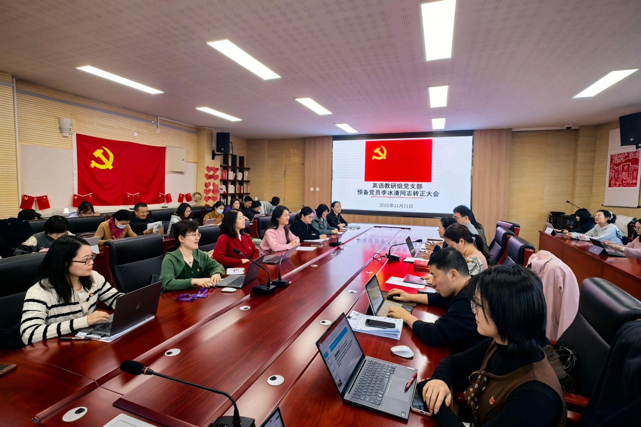 11月21日下午,澳门博彩在线英语教研组党支部在G201会议室召开预备党员李冰清同志转正大会。会议严格遵循《中国共产党党章》及《中国共产党发展党员工作细则》相关规定,本着严肃认真、公平公正的原则,对李冰清同志的转正申请进行全面审议与民主表决,进一步规范党员发展程序,强化支部组织建设。