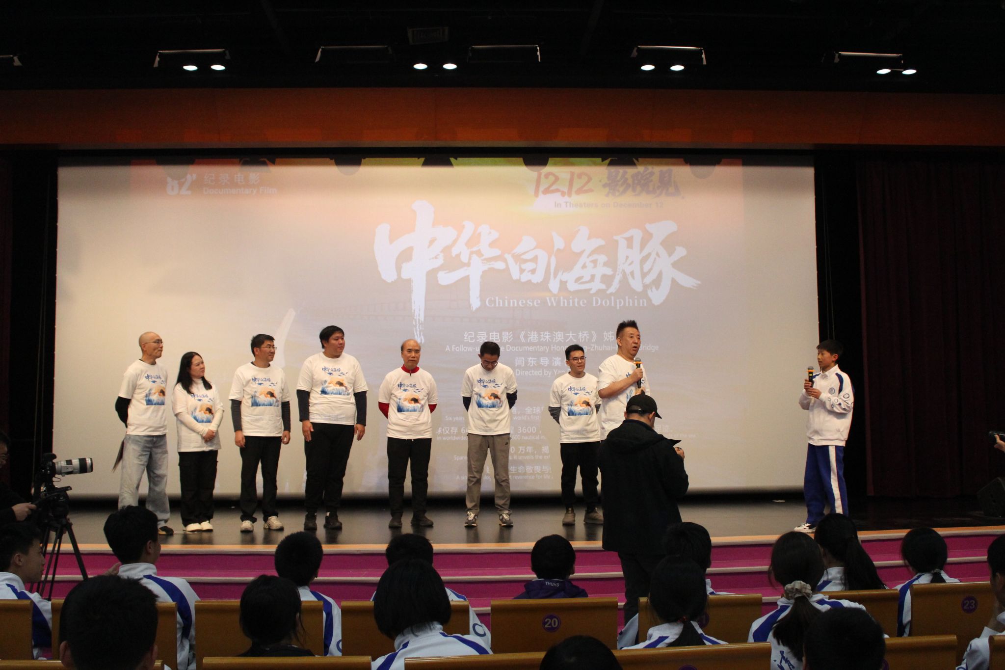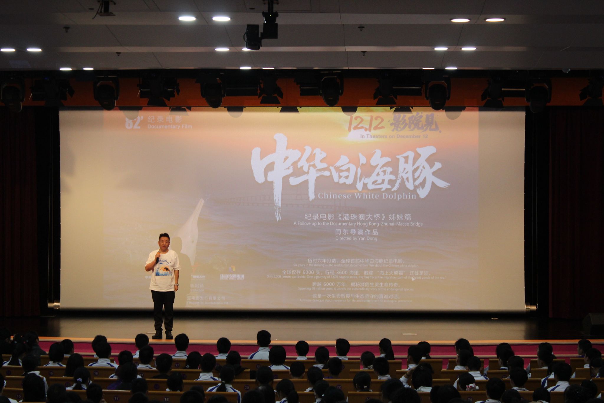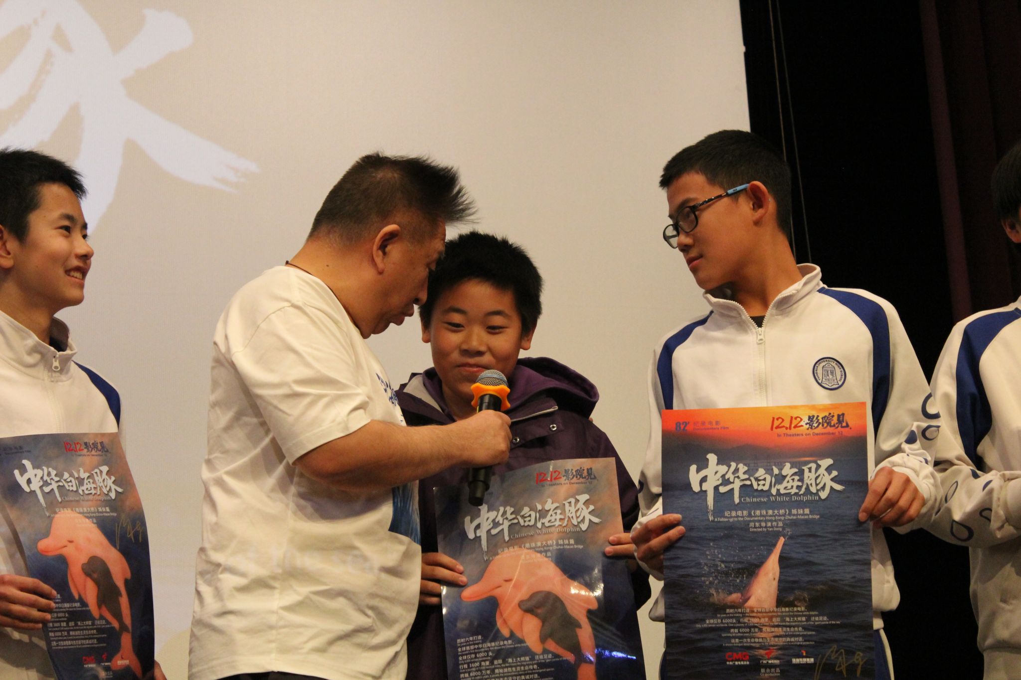 影片放映结束,进入互动环节。总导演闫东亲切地邀请台下叫团团、洋洋等小名的同学上台。团团、洋洋正是片中两只中华白海豚的名字,这份小巧思瞬间让现场气氛活跃起来。