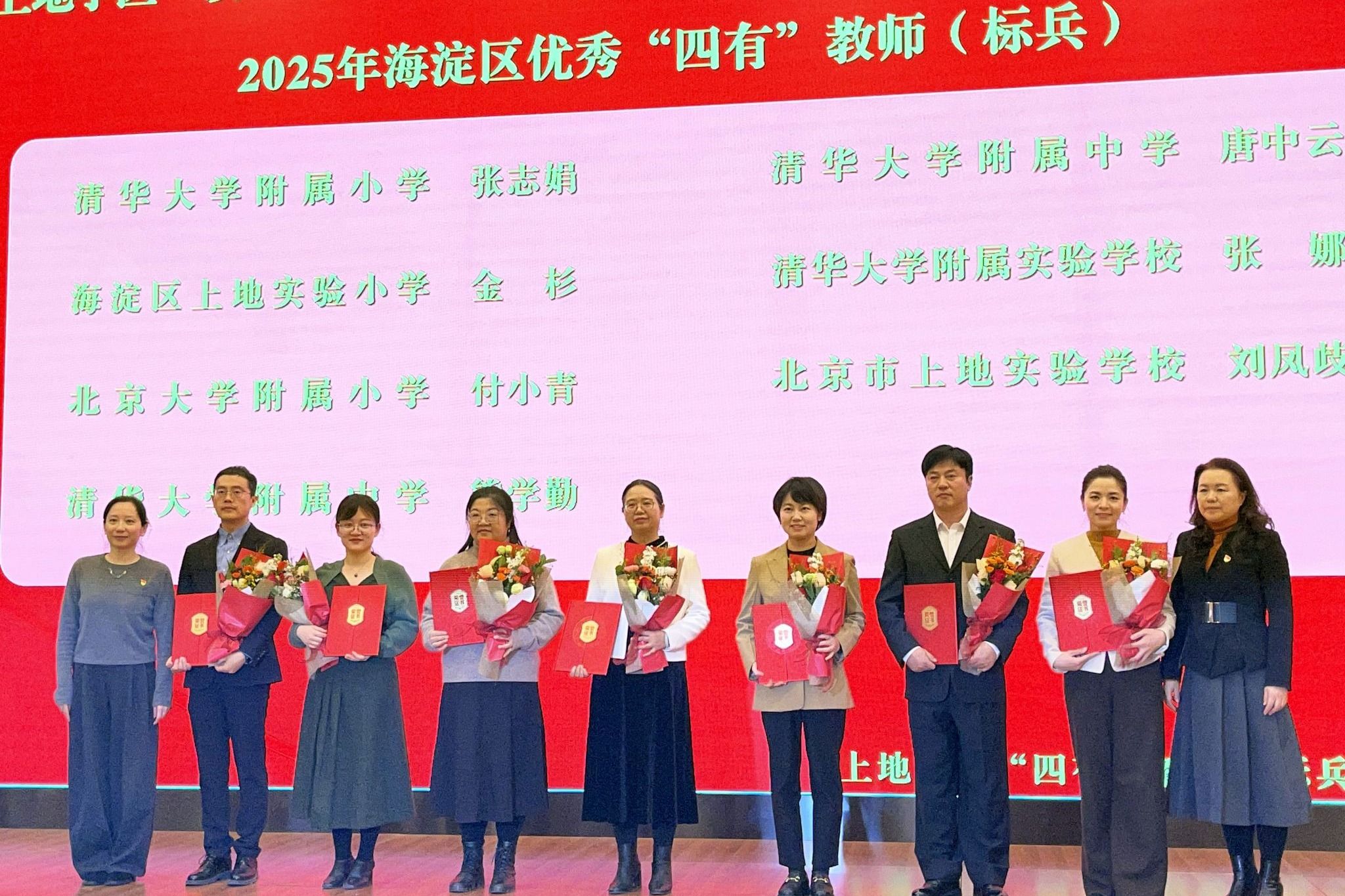 海淀区和上地学区领导为七位“四有”教师颁发证书(左三熊学琴老师、左四张娜老师、左五唐中云老师)