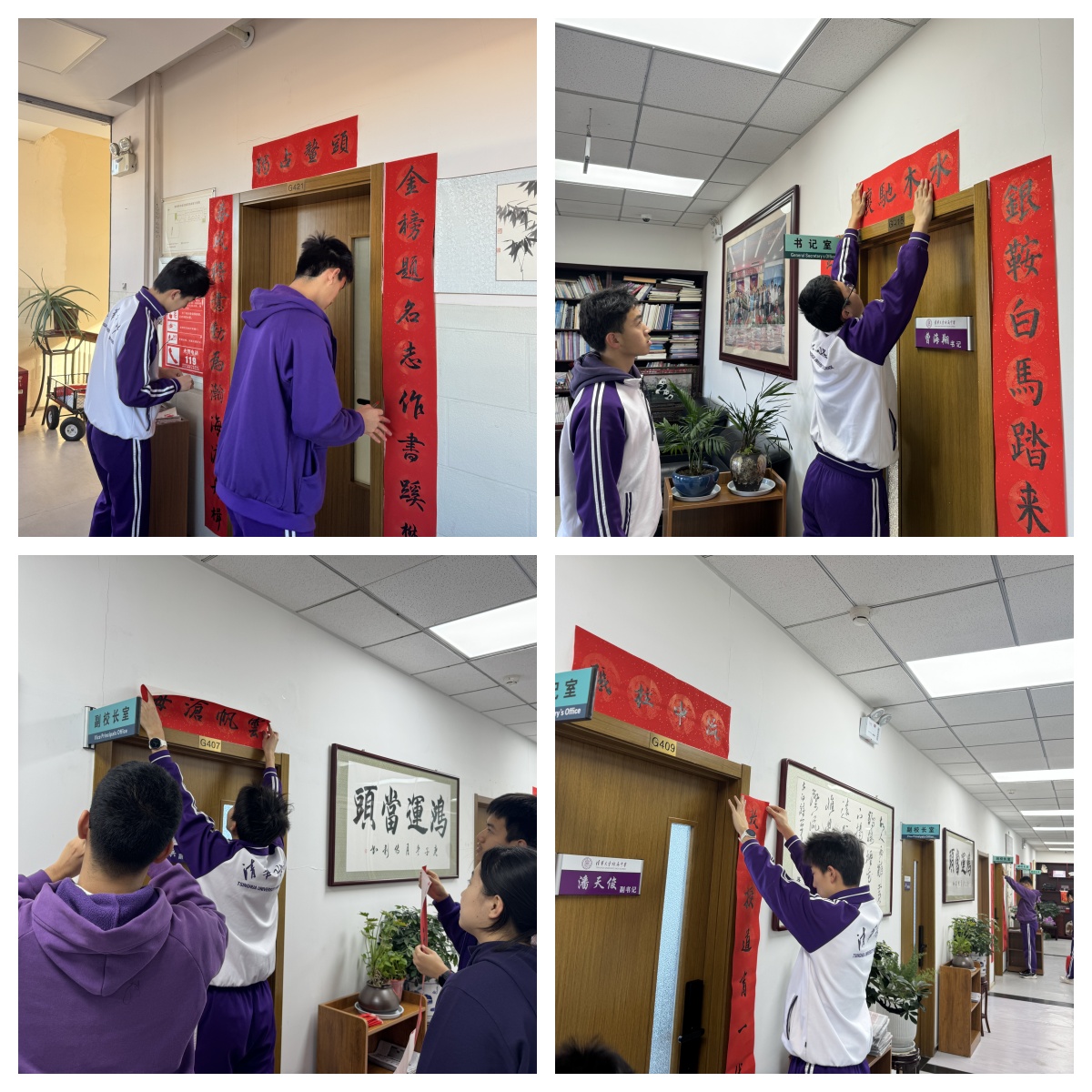 此外,高2414班的同学们在班主任杨俊老师的安排下,积极参与“水木行动”志愿张贴春联活动。同学们将饱含美好祝愿的春联张贴至成志楼、教学楼办公室门前。翰墨飘香的春联为校园增添了浓厚的节日氛围,让新春的喜悦与文化的韵味浸润校园的每一个角落。