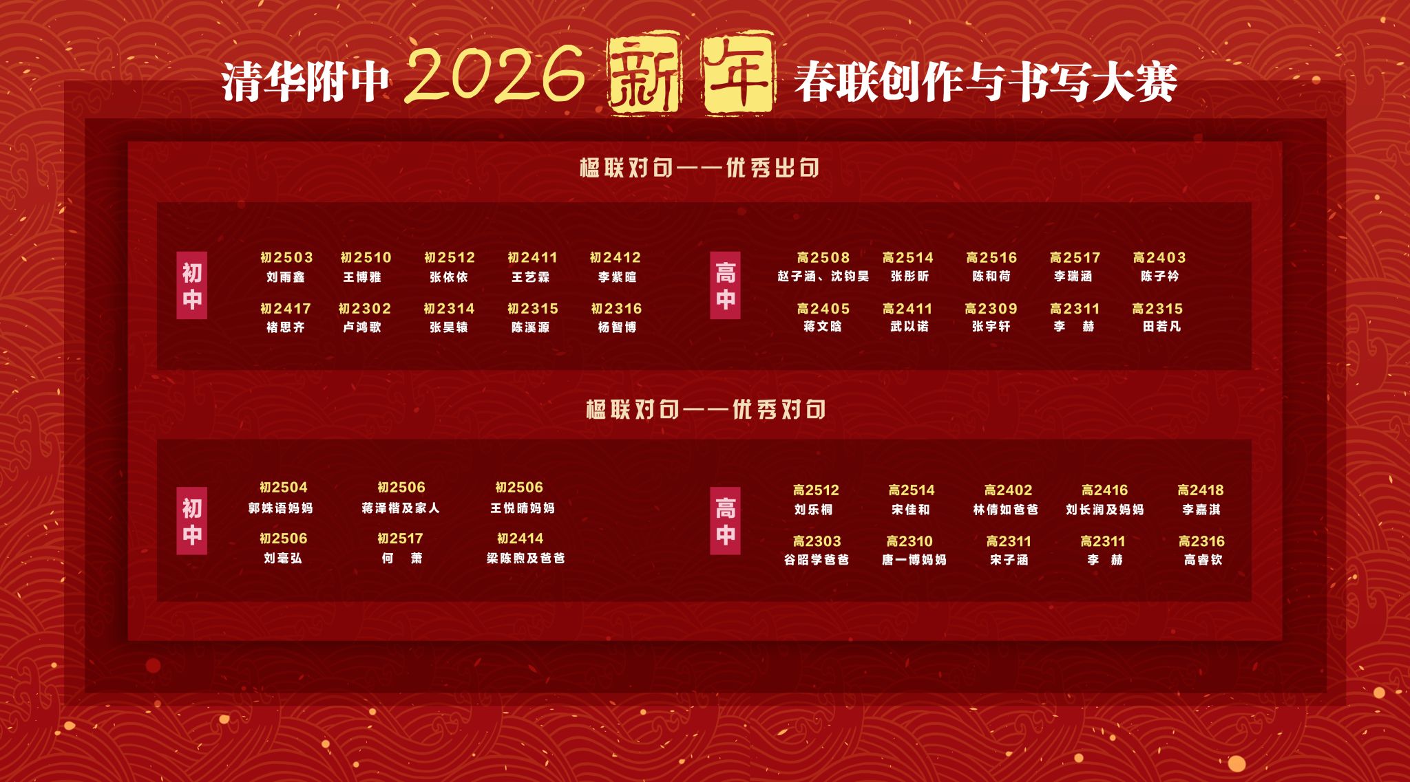 本次大赛由学生发展中心联合语文教研组、美术教研组共同举办,设置创作春联、书写春联、楹联对句三大环节,吸引了全校师生的广泛参与,共收到各类作品数百份,充分展现了大家对传统文化的热爱与传承。