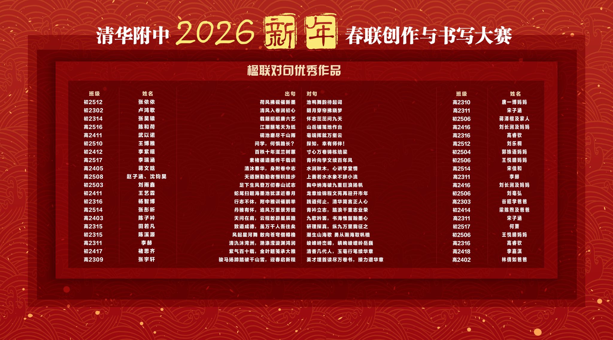 楹联对句环节通过微信平台公开征集,学生、家长、老师们积极响应,佳联妙对层出不穷。学生发展中心评选出最佳出句20句、最佳对句20句,这些作品尽显中华语言文字的博大精深,搭建起家校社协同传承传统文化的良好桥梁。