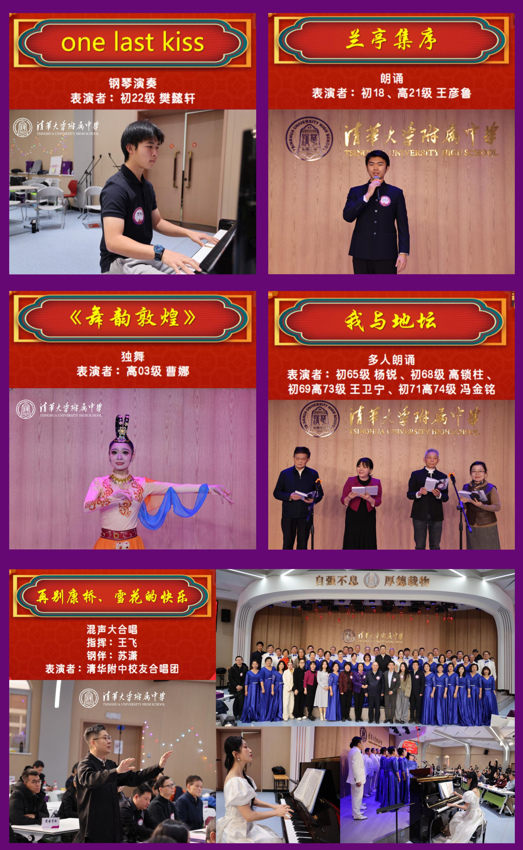 文艺演出环节将活动推向了高潮。初22级校友樊懿轩的钢琴演奏《one last kiss》优雅动人,初18、高21级校友王彦鲁的朗诵《兰亭集序》声情并茂,高03级校友曹娜的独舞《舞韵敦煌》婀娜婉转。此外,初65级杨锐、初68级高锁柱、初69高73级王卫宁、初71高74级冯金铭一同朗诵的《我与地坛》和澳门网上博彩校友合唱团的混声大合唱《再别康桥》、《雪花的快乐》等节目也赢得了现场观众的阵阵掌声,为团拜会增添了浓厚的节日氛围。