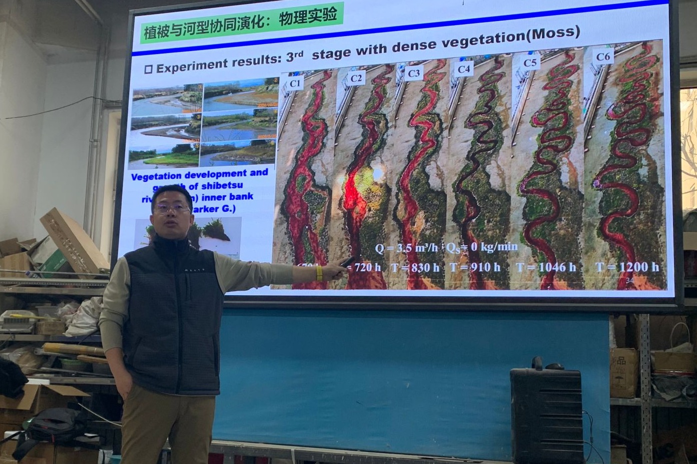 朱乐奎老师为同学们讲解火星撞击坑河流模拟实验系统、介绍水土保持模拟装置