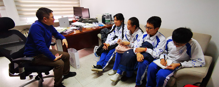 采访中,同学们和孙院士聊起了关于校园生活、数学学习和研究方向等方方面面的问题。孙院士侃侃而谈,用颇为幽默的语言一一解答了同学们的疑问。他回想起在附中短暂而又难忘的两年时光,谈起自主撰写平面几何研究论文的经历以及他高中时期课余时间的娱乐活动,还说起秋季去圆明园长跑与自费购买数学书的回忆,并教导同学们学习数学需要注意的问题。四位同学都感到受益匪浅。