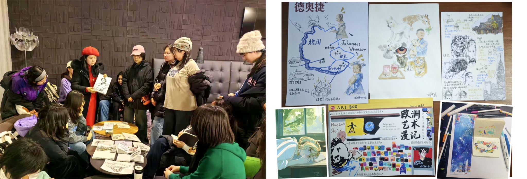 此外,结合研学活动,美术专题沙龙与阶段性创作讲评成为别样亮点。师生在轻松愉悦的氛围中分享创作灵感,探讨绘画技巧。从构图设色到主题深化,从技法打磨到跨文化艺术论题的讨论,思维的火花在云端碰撞,文化的视野在交流中拓宽。