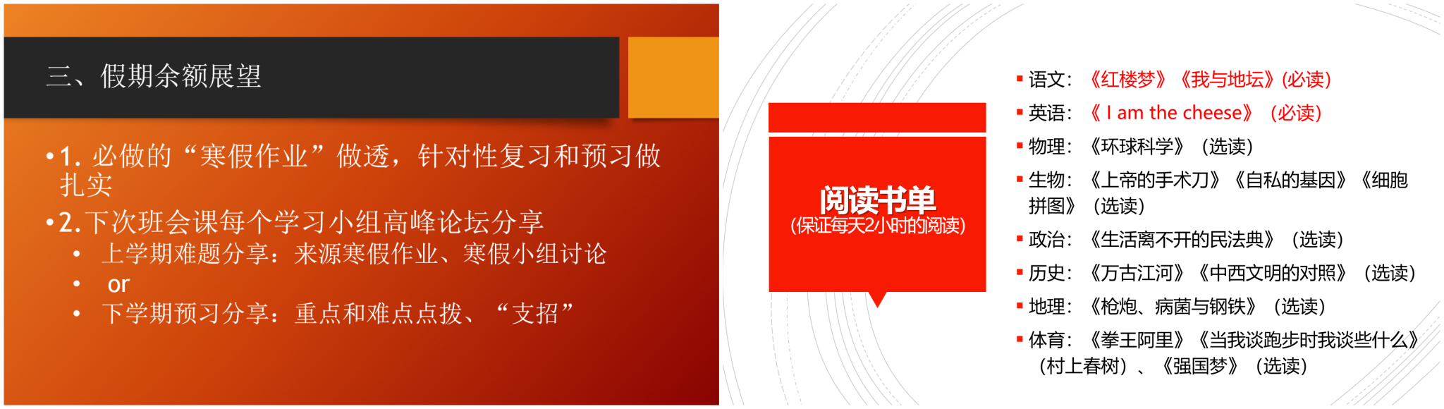 选科指导余温未散,寒假规划随即提上日程。各班召开主题班会,引导同学们合理规划假期生活。“凡事预则立,不预则废”,在班主任的指导下,同学们认真制定学习与休息相结合的计划,既有知识的温故知新,也有兴趣的拓展延伸,力求度过一个积极、充实、有价值的寒假。