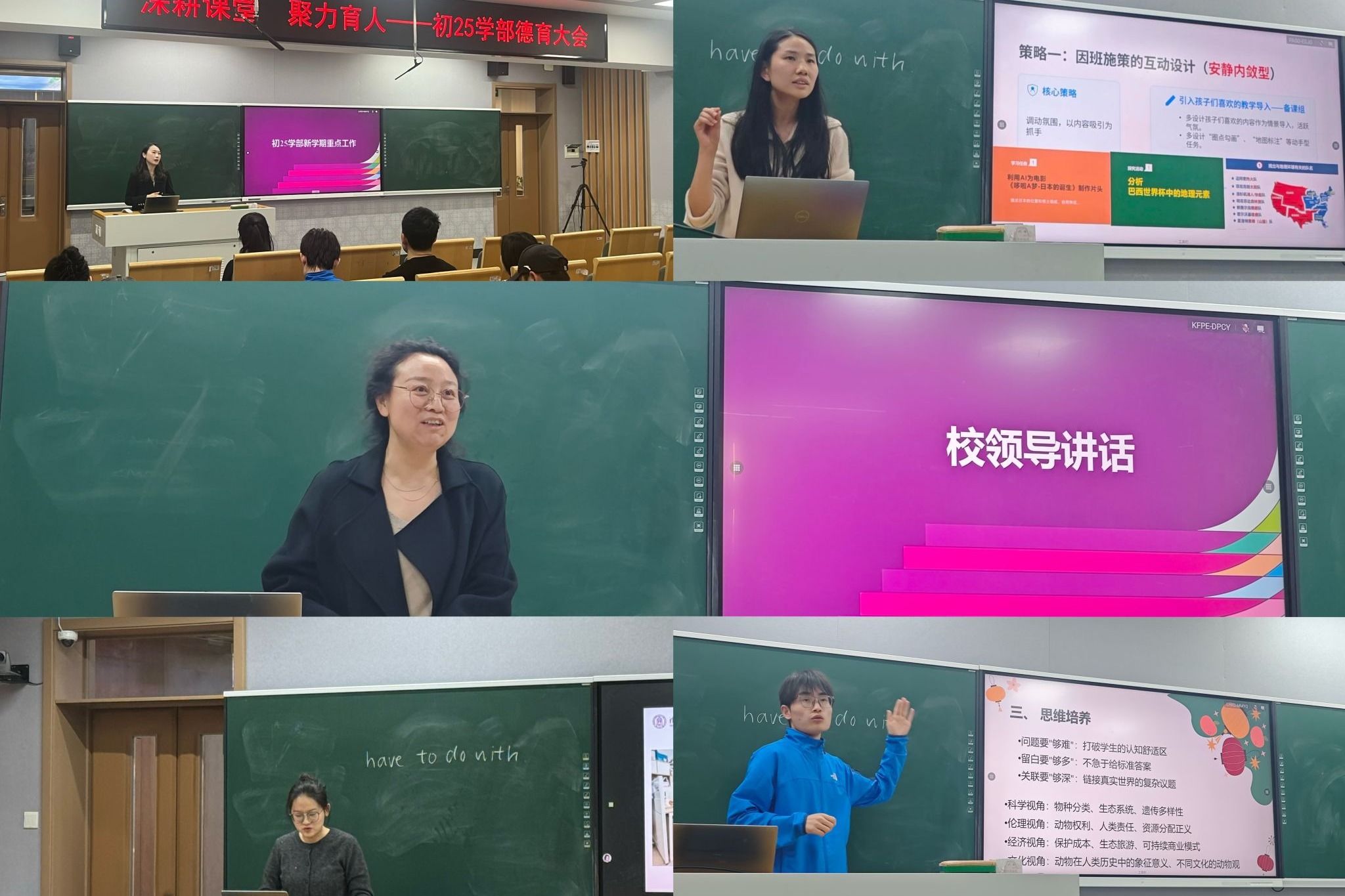 初25学部以“深耕课堂 聚力育人”为主题召开德育工作大会,副校长张苏莅临指导并为教育教学工作指明方向,要求坚守师生身心健康首位原则,抓实课堂教学效率、深化家校协同育人。冯明、刘春媛、周小康三位教师分享了深度课堂建设、高效教学方法、差异化班级管理的宝贵经验,学部还围绕圆明园校本课程落地、校园阅读活动推进展开专题研讨 。学部主任那妮解读新学期重点工作部署,号召全体教师凝聚育人合力,推动德育与教学工作提质增效。