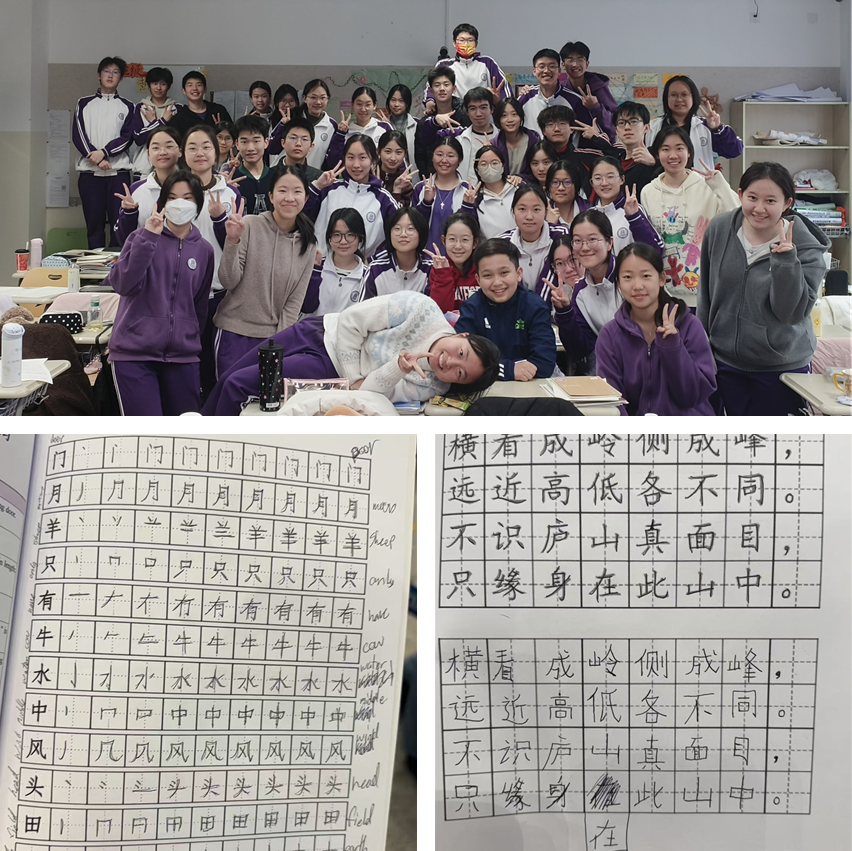 姊妹校同学与所在交流班级合影,姊妹校同学在附中观课期间练习的中文字帖展示